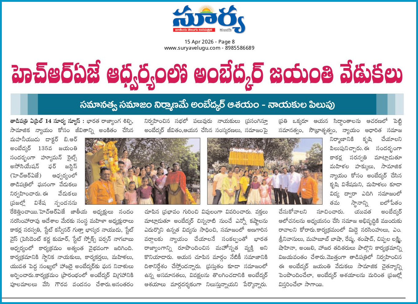 • హ్యూమన్ రైట్స్ అసోసియేషన్ ఫర్ జస్టిస్ ఆధ్వర్యంలో అంబేద్కర్ గారి 135 వ జయంతి వేడుకలు